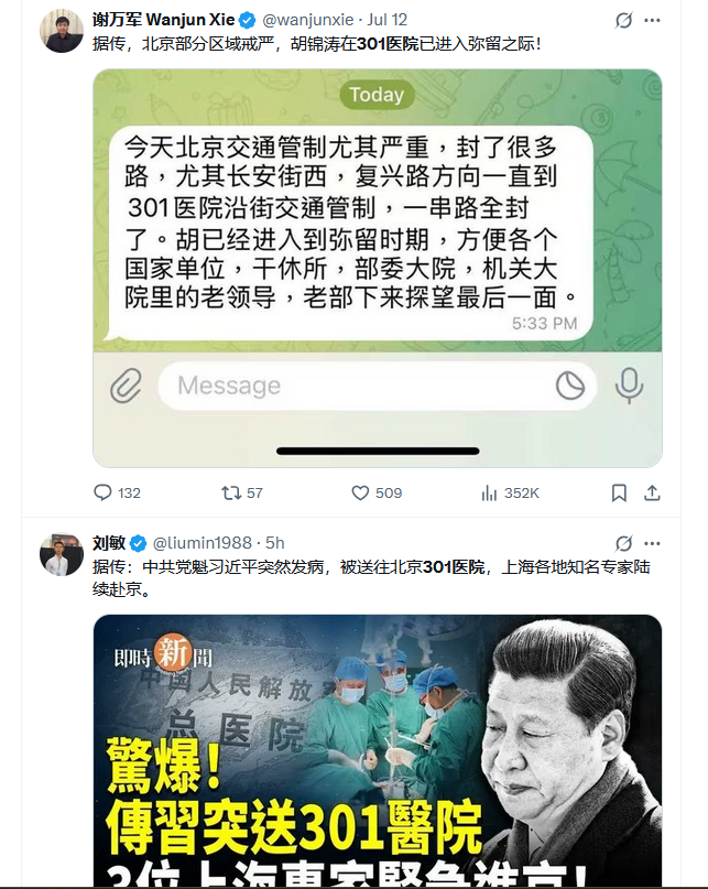 有分析指出,习近平虽然在党内的军权掌握受到一定制约,但他试图通过大规模军演和宣传手段,营造“大权在握、胜利者归来”的气势。相关人士称,这一行动的主要目标是通过形象工程和强势场面来稳固民众认知,进一步巩固其在党内及全国范围内的统治地位。习近平再次进入301医院CPU,北京军管可能是这厮处于弥留之际